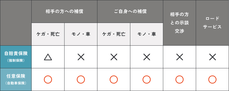 - 義務付けられている「自賠責保険」と、任意で契約する「任意保険」がある。
