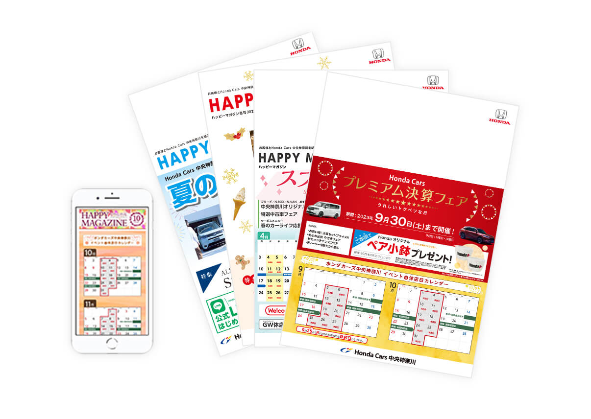 お客様とのコミュニケーションの一環として、Honda Cars 中央神奈川独自の情報誌「HAPPY MAGAZINE」を定期的に発行しています。これは2002年から始まりました。クルマのさまざまな情報はもちろん、神奈川県のドライブ情報やクルマの整備の情報など、盛りだくさんのDMをすべてのお客様のもとにお届けしています。