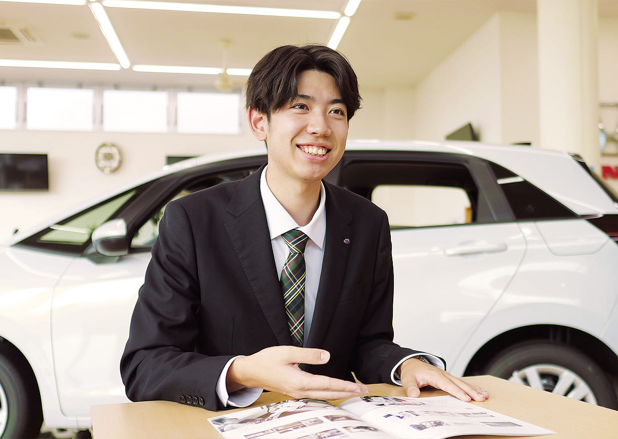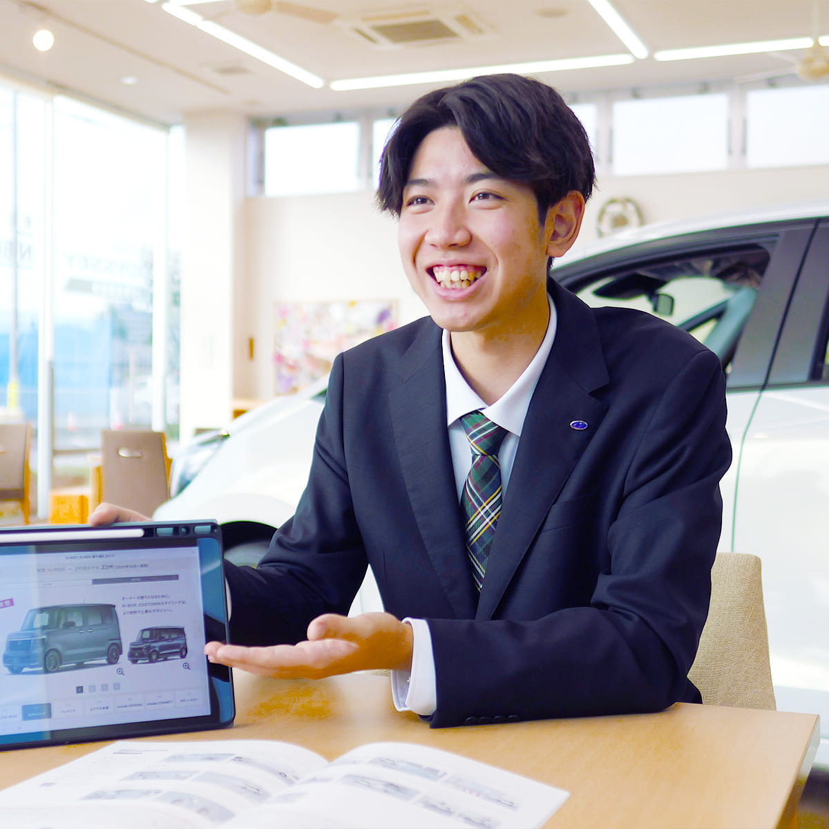 営業スタッフの仕事は、お客様と商談し、クルマを売ることだけではありません。お客様にとっては、クルマを購入したときが新しいカーライフのスタート。ですから日々のメンテナンスや定期点検のご案内などのアフターフォローを通じて、お客様に長く寄り添っていくことも私たちの重要な役割となります。