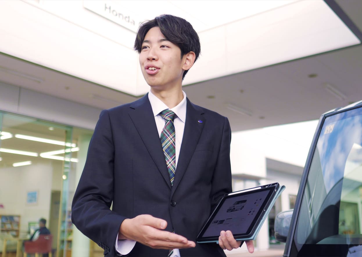 お客様から直接「ありがとう」と感謝の言葉をいただけるような仕事に就きたい。そんな想いを胸に就職したのが、Honda Cars 中央神奈川の営業スタッフでした。家族主義という考え方に共感したことも入社の決め手となりましたね。実際に今は、仕事を通じてたくさんのお客様と出会い、感謝と笑顔に溢れる充実した毎日を過ごすことができています。