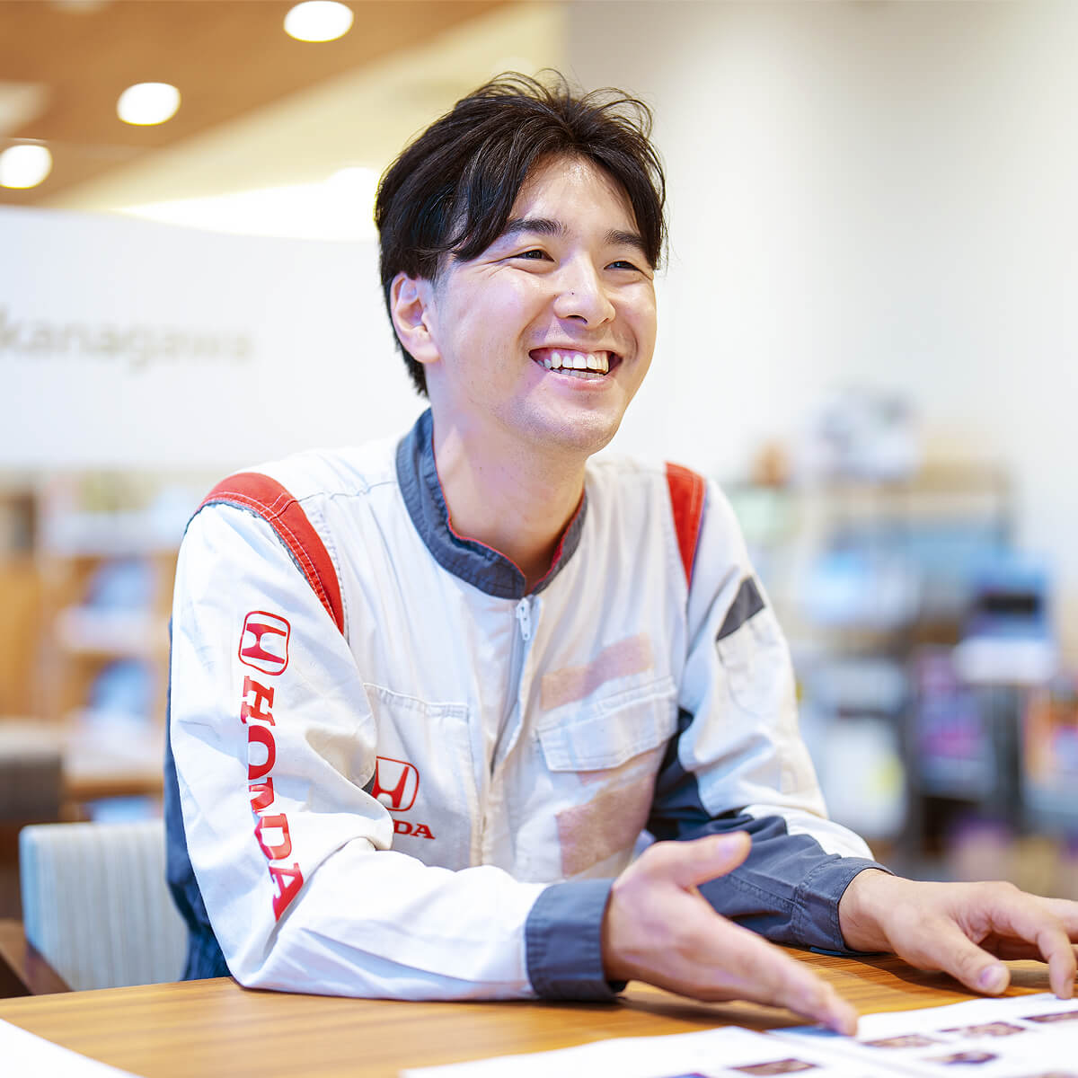子供の頃からクルマが好きで、将来は自動車業界に進みたいと思っていました。その夢を叶える会社としてHonda Cars 中央神奈川を選んだきっかけは、専門学校時代に洗車のアルバイトをさせていただいたこと。和気あいあいとした職場でありながらも、決して慣れあいの関係ではなく、家族主義という考え方にも共感できたことが決め手となりました。