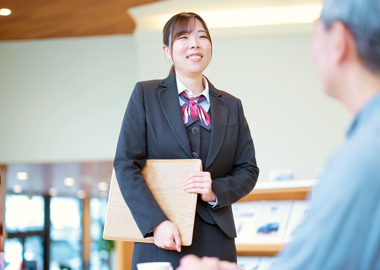 午前は接客が中心で、ご来店されたお客様へのお茶出しや、点検の受付などを行います。